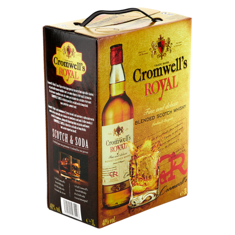 Віскі Cromwell's Royal - це якісний алкогольний напій родом із Шотландії, країни, що славиться своєю багатою історією виробництва віскі. Cromwell's є частиною давньої традиції шотландського віскікуріння, яка налічує століття. Бренд отримав свою назву на честь відомої історичної фігури та прагне передати високі стандарти та майстерність, закладені в кожній пляшці.